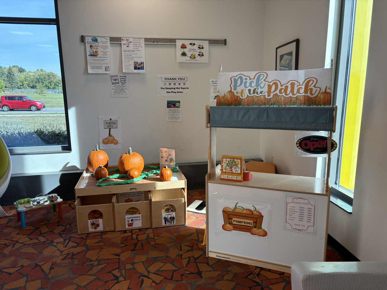 I created this dramatic play area for the library. I am a librarian. I got real pumpkins, brown fabric, and green bulletin board paper that I cut and twisted into vines. I used laminated cardstock seeds and included a trowel, mini rake and watering can. I also had fabric leaves and a rake. The center included a scale and measuring tape to measure the pumpkins, gourds and mini pumpkins, and laminated life cycle cards. Finally, I used a virtually indestructible old fisher price cash register. The kids had a great time!