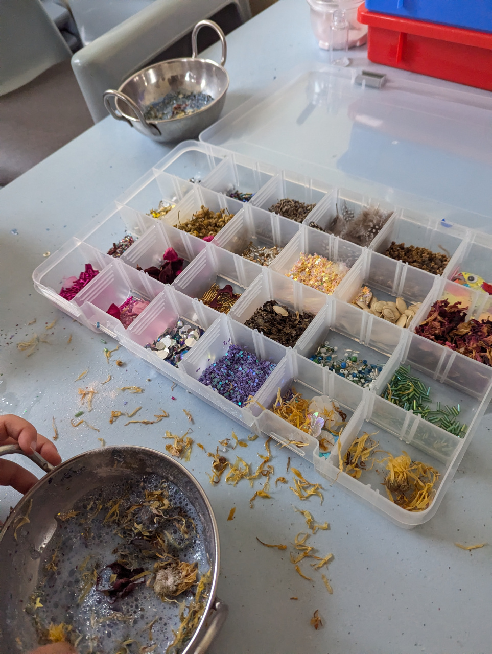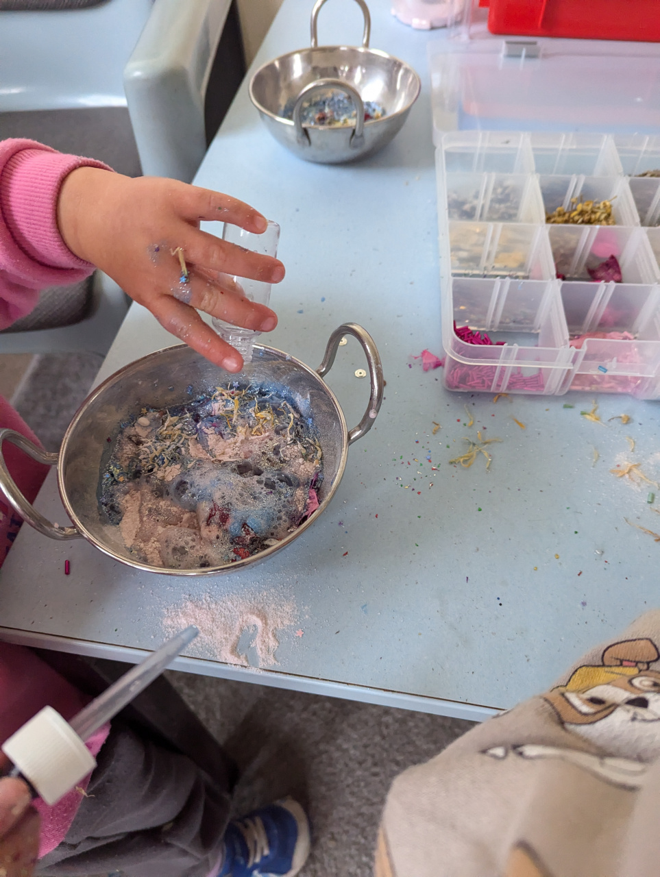2. Let children mix the potion base with glitter, dried flowers, leaves or any other potion ingredients the want.