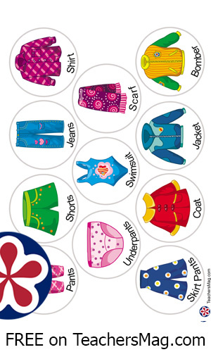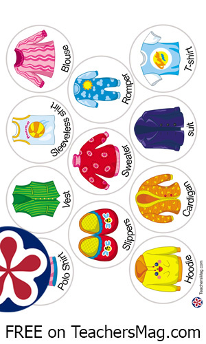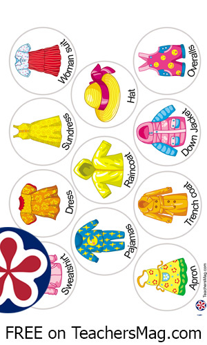 Flashcards: socks, gloves, mittens, baseball cap, boots, hat, sneakers, sheepskin coat, robe, skirt, polo shirt, vest, sleeveless shirt, blouse, sleepers, sweater, romper, cardigan, suit, t-shirt, pants, shorts, jeans, shirt, underpants, swimsuit, scarf, skirt pants, coat, jacket, bomber, sweatshirt, frock, raincoat, pullover, apron, cape, trench coat, down jacket, overalls.