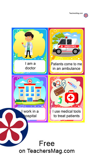 Option 1: This is similar to bingo. You hand-out large cards to children and take-out the cards one by one, reading the text upon it and then give it to a child how has the same profession.
