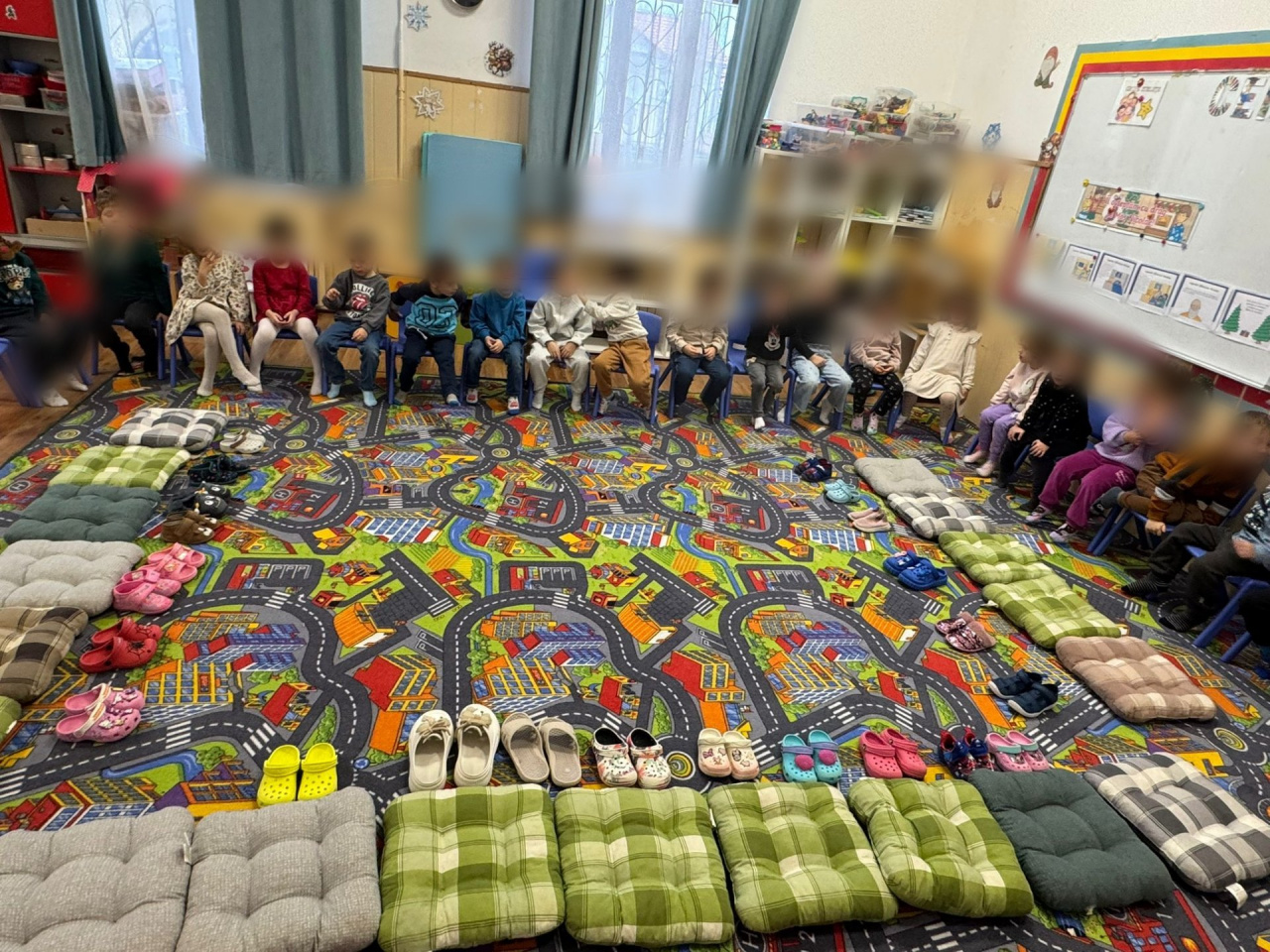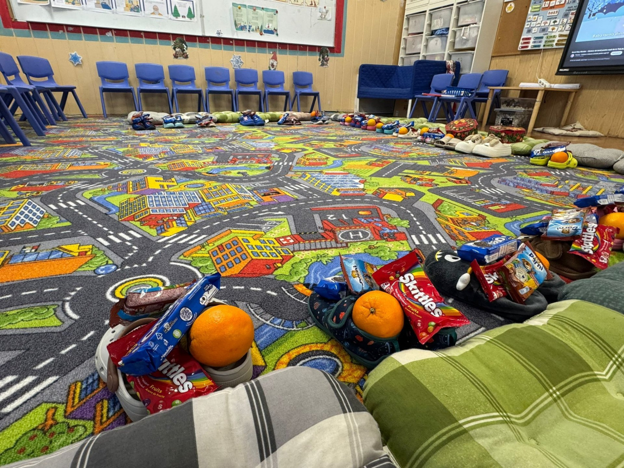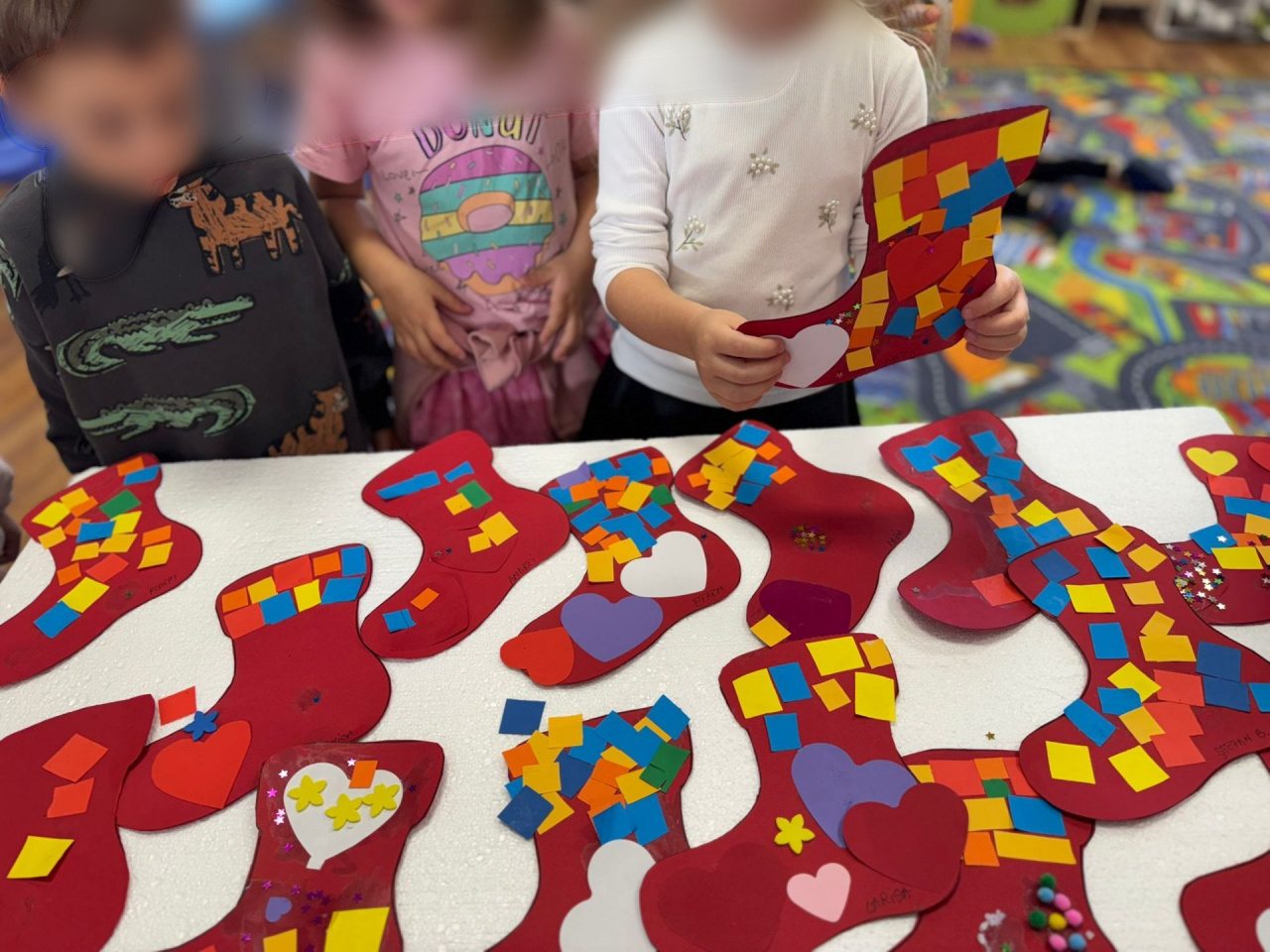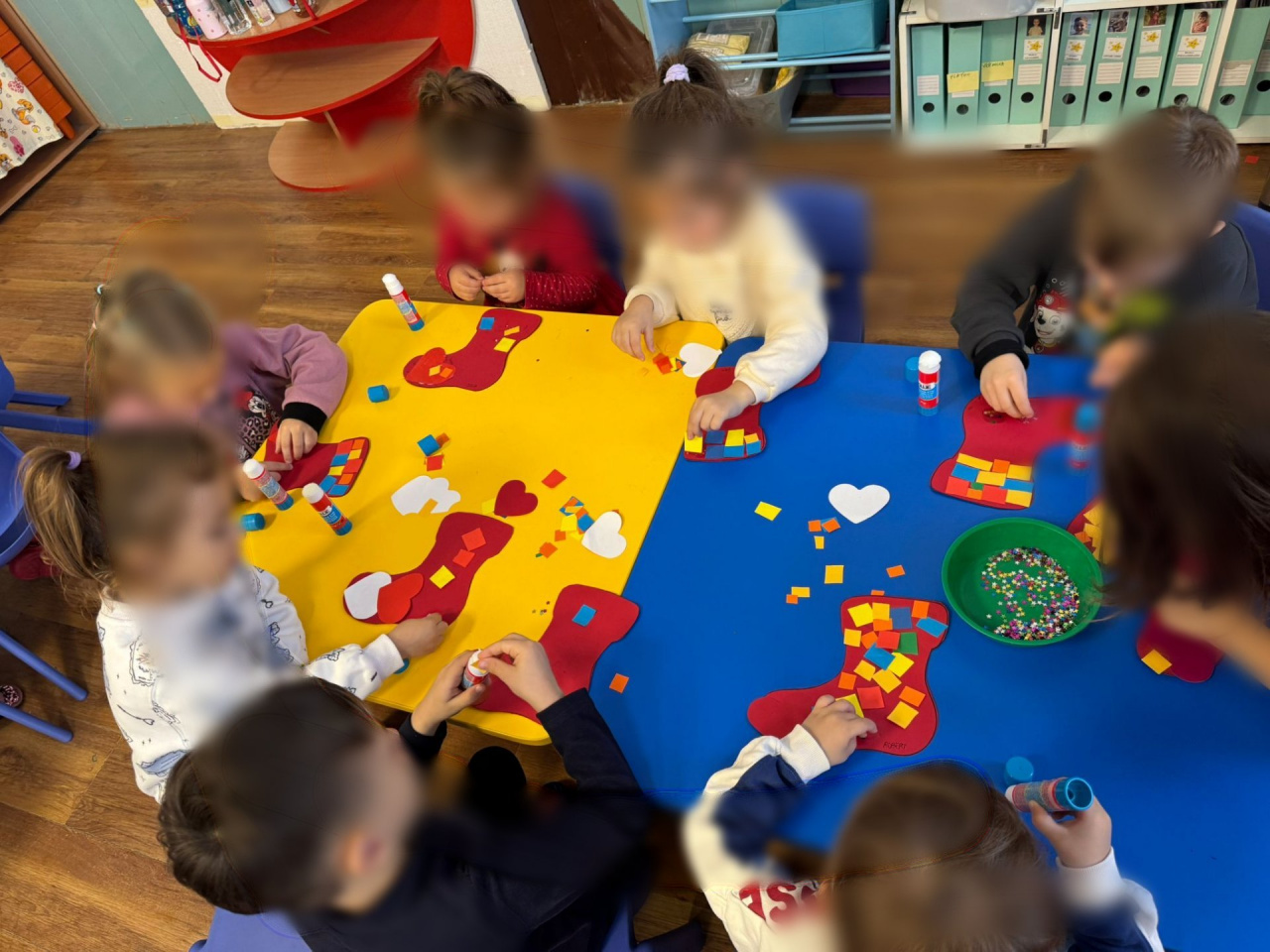 The materials used: paper boots, small pieces of paper of different colours, glue sticks, pillows, shoes.