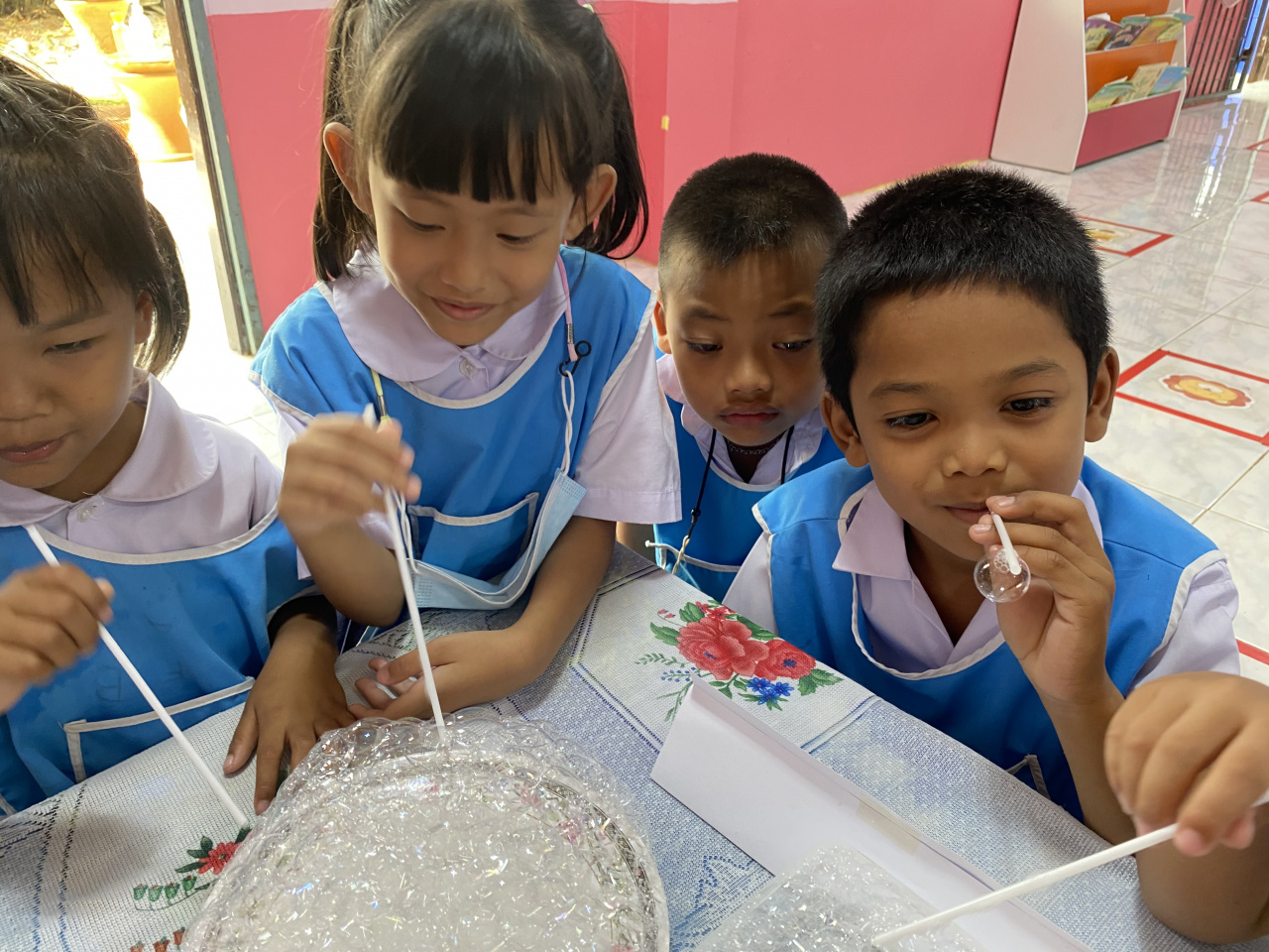- เด็กได้เรียนรู้ในเรื่อง สนุกกับฟองสบู่ ซึ่งจากการทดลองจะสังเกตได้ว่า สารลดแรงตึงผิว สามารถทำให้เด็กๆเป่าน้ำให้เป็นฟองลอยในอากาศได้ ฟองสบู่เป็นทรงกลมเสมอ และเมื่อแสงส่องผ่านฟองสบู่จะมองเห็นฟองสบู่เป็นสีรุ้ง